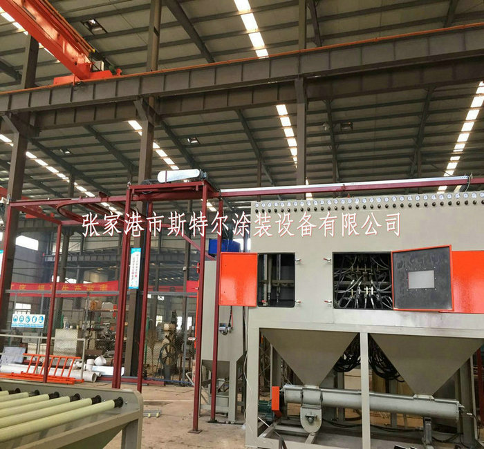 從外型結構上來來說,吊鉤式自動噴砂機可以分為懸掛鏈式吊鉤噴砂機和電動葫蘆式吊鉤噴砂機,吊鉤是自動噴砂機 的組成部分有吊具系統一套,噴砂主機箱體一套, 噴砂系統一套,砂料回收系統及分離系統一套,電控系統一套,除塵系統一套。其中吊具系統是根據客戶的產品來選定的,它可以分為電動葫蘆式吊具系統和懸掛鏈吊具系統,噴砂主箱體為噴砂進行的空間,在噴砂主箱體內設置了根據客戶要求配置的噴砂槍,比如說12把,16把,24把等,每把槍都可以單獨控制。在噴砂進行的同時,砂料也通過回收管道回收到旋風分離器處,通過旋風分離系統,把砂塵分開,砂料會自動落回儲料倉內循環使用,粉塵會被抽進除塵箱內,除塵箱一般根據工作艙尺寸和噴槍數量,來選擇除塵箱濾筒數量及功率。工人在噴砂作業結束時,可以按設備控制面板上的脈沖除塵按鈕,定期清理除塵箱及清理集成箱內的灰塵。 該套設備的控制系統一般有風機啟動,風機停止,每把噴槍的單獨控制按鈕,照明開關,吊鉤正反轉控制鈕,吊鉤進出控制按鈕,時間控制系統,吊鉤轉速控制系統,脈沖除塵按鈕等,當控制比較復雜的時候,還可以做成plc控制系統。整套設備都可以根據客戶的需求進行定制。